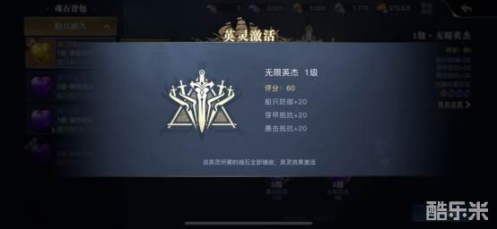 英灵印刻是给装备镶嵌各种魂石,用以增加船只的各项属性。需要注意,魂石除了增加基础属性,还有英灵觉醒的属性。因此我们前期按照1橙3紫的配置去镶嵌魂石,可以做到增加基础属性的同时,激活英灵属性,将战力加成最大化。由于魂石获取途径比较多,前期可以轻松做到1橙3紫。随后积攒足够的魂石碎片、钻石、勇士徽章等资源,在魂石商店、奇珍馆和积分商店中购买橙色魂石,这样凑齐4橙魂石配置,可以增加更高的属性与评分。