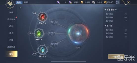 武器精通是角色在陆战时可以使用的技能,不同武器技能效果和外观都不同,比如刺剑,剑身纤细匀称,比较灵活,而双手剑则比较宽阔霸气,虽然笨重但威力十足。武器精通的等级会随着玩家等级而提升,我们只需要选择喜欢的武器即可。秘宝可以增加船只属性,这里分为星辰、森林和海洋三种,其中星辰和海洋,可以通过探险获取,森林之力则是在地图探索中获得,我们可以均衡去搜集这些材料,用来提升船只属性。