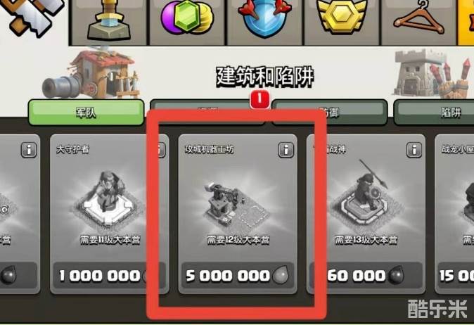 1、攻城机器工坊在12级大本营,花费5百万圣水可以完成修建。
