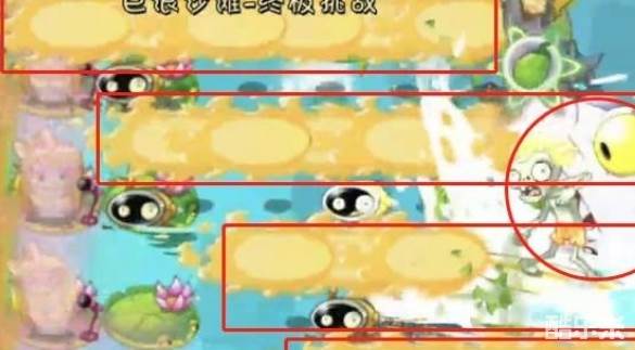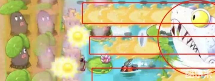 4.其次就是鲨鱼僵尸此时会释放的技能,如图所示或随机在两排植物道路上进行吸取,被吸取的道路将没有植物,还要重新摆放,以及随机在河面上抽取几个位置释放鲨鱼,被选中的植物位置都会被鲨鱼吃掉,还要重新摆放,并且这些技能是无法躲避的。