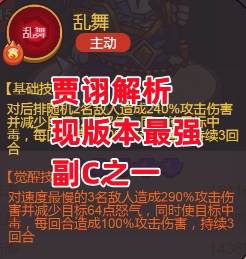 贾诩不是一位打输出的武将,伤害可以忽略不急,贾诩主要是功能型武将,这个技能觉醒之后减怒气从42点增加到64点,并且是对速度最慢的3名敌人,对敌方挂件还是挺有克制效果的,加上专属鱼的减怒,能给敌人造成不小的麻烦。