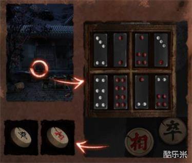 5、后院桌子处,如图排列牌九的位置,可以拾取象棋卒和象棋相。