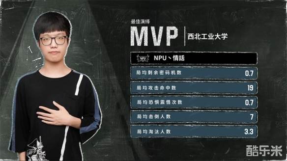 本次赛事的FMVP选手是西北工业大学队的NPU丶情話。在比赛中,他的绝活摄影师极具压迫感,曾多次四抓,同时他也掌握着破轮和梦之女巫两大比赛强势角色,红蝶和红夫人的熟练度同样不俗,是一个角色池很广,实力强劲的监管者选手。