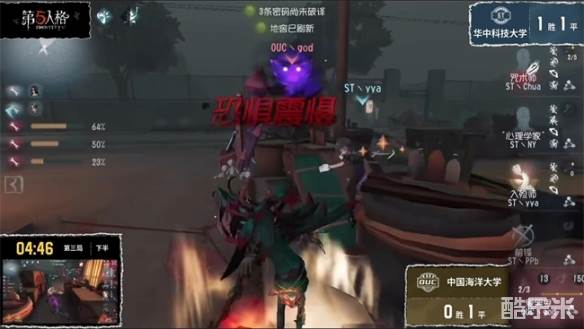 半决赛华中科技大学队对阵中国海洋大学队第三局下半局,OUC丶god爱哭鬼精准拉火,控场四抓:永眠镇爱哭鬼开局拿到前锋一刀后,换追咒术师,果断选择闪现开刀,再利用一阶技能快速逼近咒术师拿到第二刀,将咒术击倒并挂在独栋。后爱哭鬼拉火命中来救人的前锋,打残状态后,换挂道具所剩无几的前锋。淘汰前锋后,爱哭鬼乘胜追击,闪现震慑入殓师,续上节奏,再不断消耗求生者的状态,最终控场完成四抓,奠定胜局。