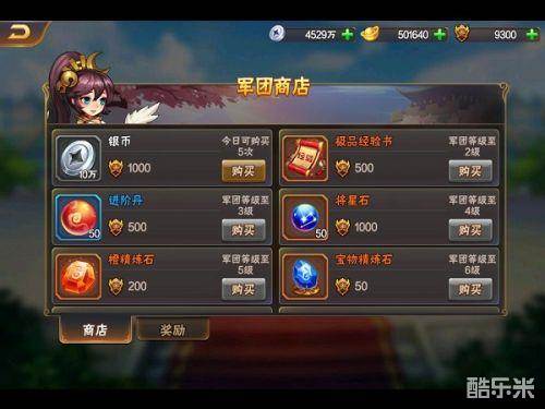 玩家可以凭借声望,在军团商店中兑换进阶丹、银币等物品。