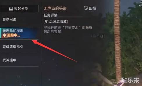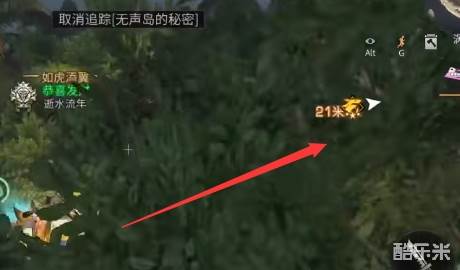 6、最后收集齐所有的宝箱之后我们回到初始位置,如果小伙伴们找不到的话可以点开任务菜单,点击取消追踪[无声岛的秘密]之后再重新追踪一下即可显示位置,找到之后我们挖出宝箱即可完成这个任务。