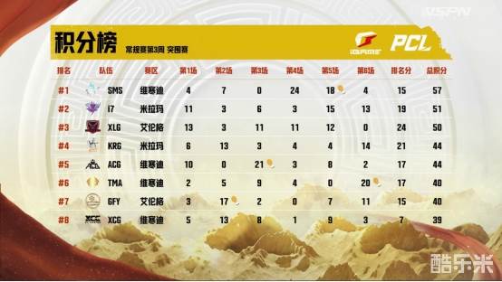 SMS战队周中赛排在倒数第四的位置,但在突围赛,队内755选手和Neo选手挥舞反击的大旗,分别以34.7%和26.1%的得分贡献率帮助队伍以57分的积分头名突围周决赛;i7战队运营思路清晰,以19分的排名分结合Me1Mei选手的淘汰分,帮助队伍拿到51分排在第二;XLG战队的TEBIE272选手则是在突围赛中以高达1924的伤害值,帮助队伍拿到50分总积分居于第三;此外,TMA战队、GFY战队和XCG战队以相近的总积分踩线晋级周决赛,而iFTY战队却没能像上周一样在突围赛中力挽狂澜,遗憾地以一分之差与周决赛失之交臂。