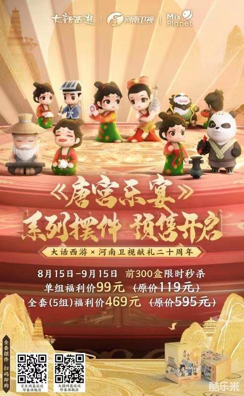 大话西游X河南卫视唐宫乐宴系列摆件今日正式开售,8月15日至9月15日,限时秒杀活动福利来袭。活动期间,原价119元的单组摆件福利价99元,原价595元的全套摆件福利价469元,前300盒限时秒杀,比拼手速的时候到了,赶快参与秒杀吧!