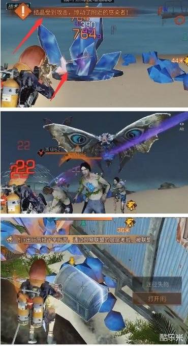3、然后跟随地图的指引找到三处晶石,破坏晶石将会吸引到感染者来袭,我们需要全部清理掉。