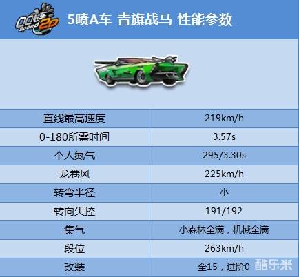 青旗战马的性能整体来说中规中矩,A车的中等水平。但是它的外形和特效都很不错,车身较轻,需要加一点悬挂更适合实战。