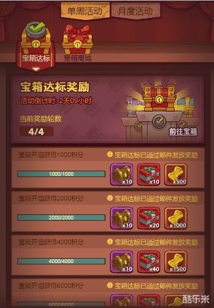 宝箱达标:宝箱开启积分达到对应的积分将会获取一系列丰富的奖励,一共可以完成四轮