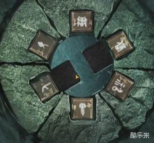 4、点击左边的门来到机巧阁,把轮状零件放在凹槽上面,齿轮转动中间有字是正门上面的线索,女生切换视角男生,把字填到男生视角门上面,密码如下图,打开门。