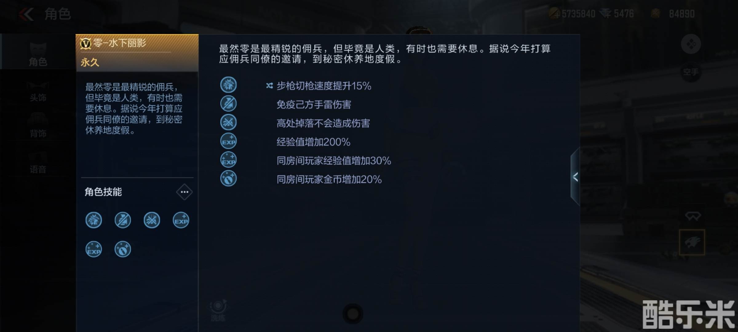 接着咱们来看看各位CFer们关心的属性问题,与原版角色—零相比,这款零-水下丽影除了继承原版零的防雷防摔经验金币加成之外,竟然还具有一个可洗练的专属技能卡槽?在这其中有大家所喜爱的减免闪光技能,加上原有属性即可凑齐三防,在爆破对局下还是非常实用的。