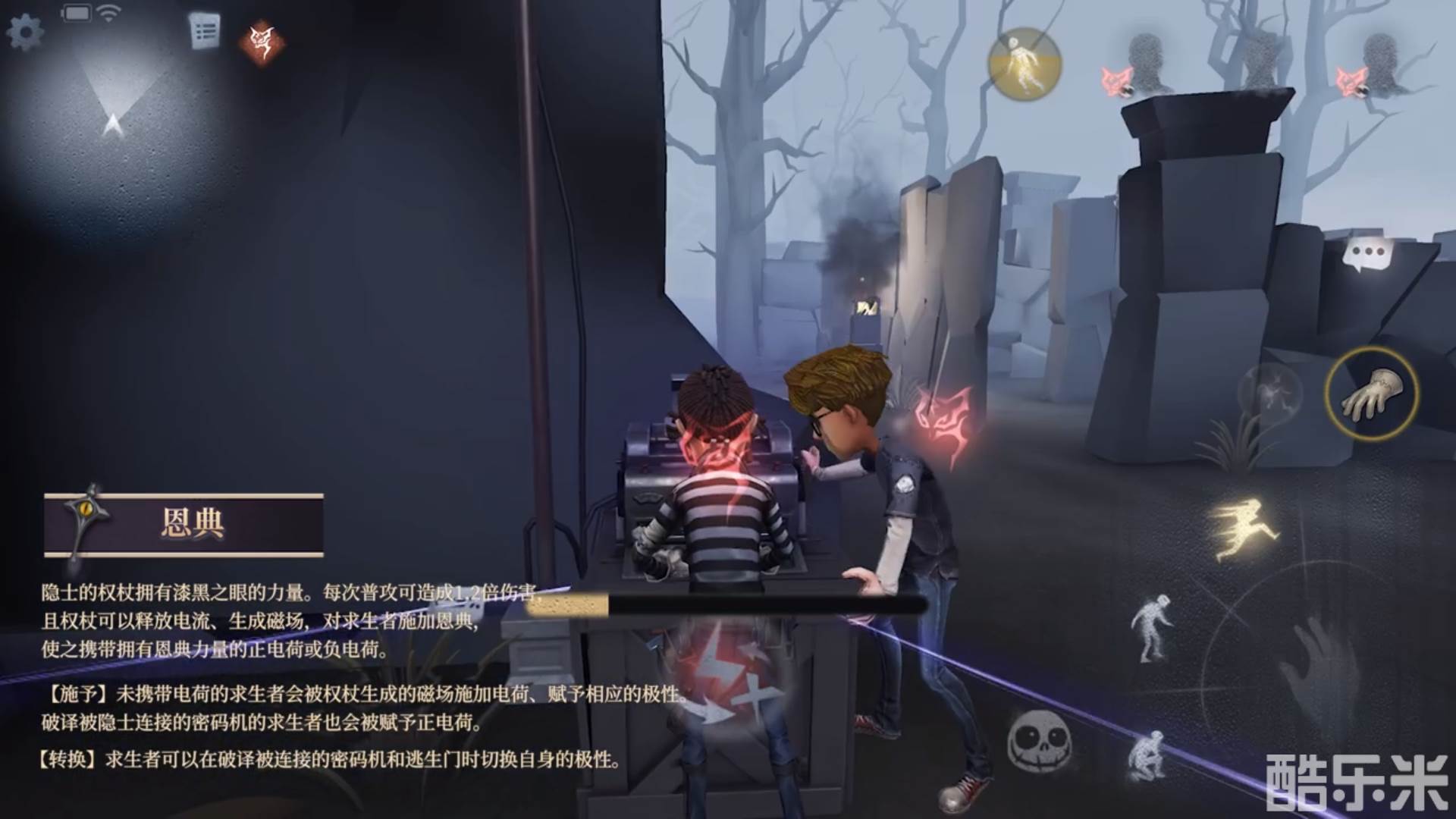 隐士拥有“恩典”和“分享”两大外在特质,不仅每次普攻可造成1.2倍伤害,还可为释放电流,生成磁场,连接密码机和求生门,为求生者附加与电荷属性相应的极性。拥有极性的求生者将分担同极性队友受到的攻击伤害,也可在特定条件下切换自身极性。
