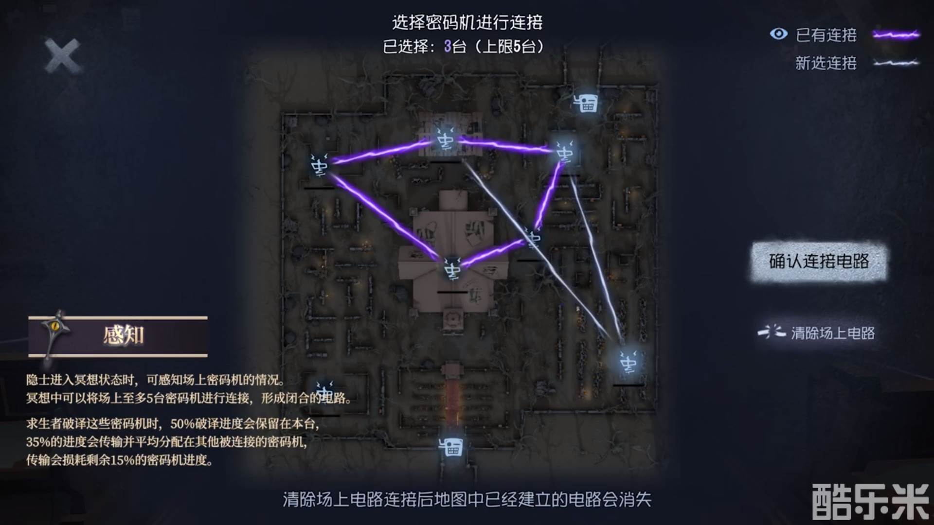 追逐中,隐士可施展“奇迹”,向镜头方向发射电磁能量团,命中场景后可生成磁场,为范围内无极性的求生者赋予电荷,并将极性相反的求生者拉向中央造成短暂眩晕;也可以通过“极性切换”改变电荷的极性,令对手措手不及;还可“感知”场所密码机的情况,将至多5台密码机连接,令求生者的破译进度在密码机间共享并产生一定幅度的损耗。