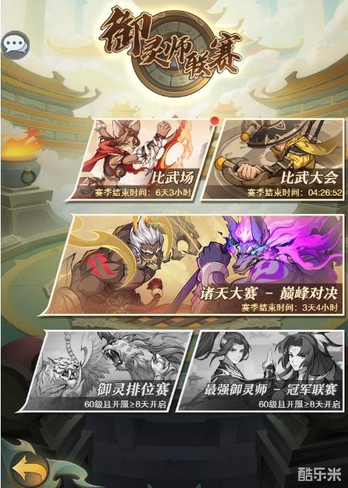 如上图所示,御灵师联赛总共分为5个赛事,分别为:比武场、比武大会、诸天大赛-巅峰对决、御灵师排位赛、最想御灵师-冠军联赛