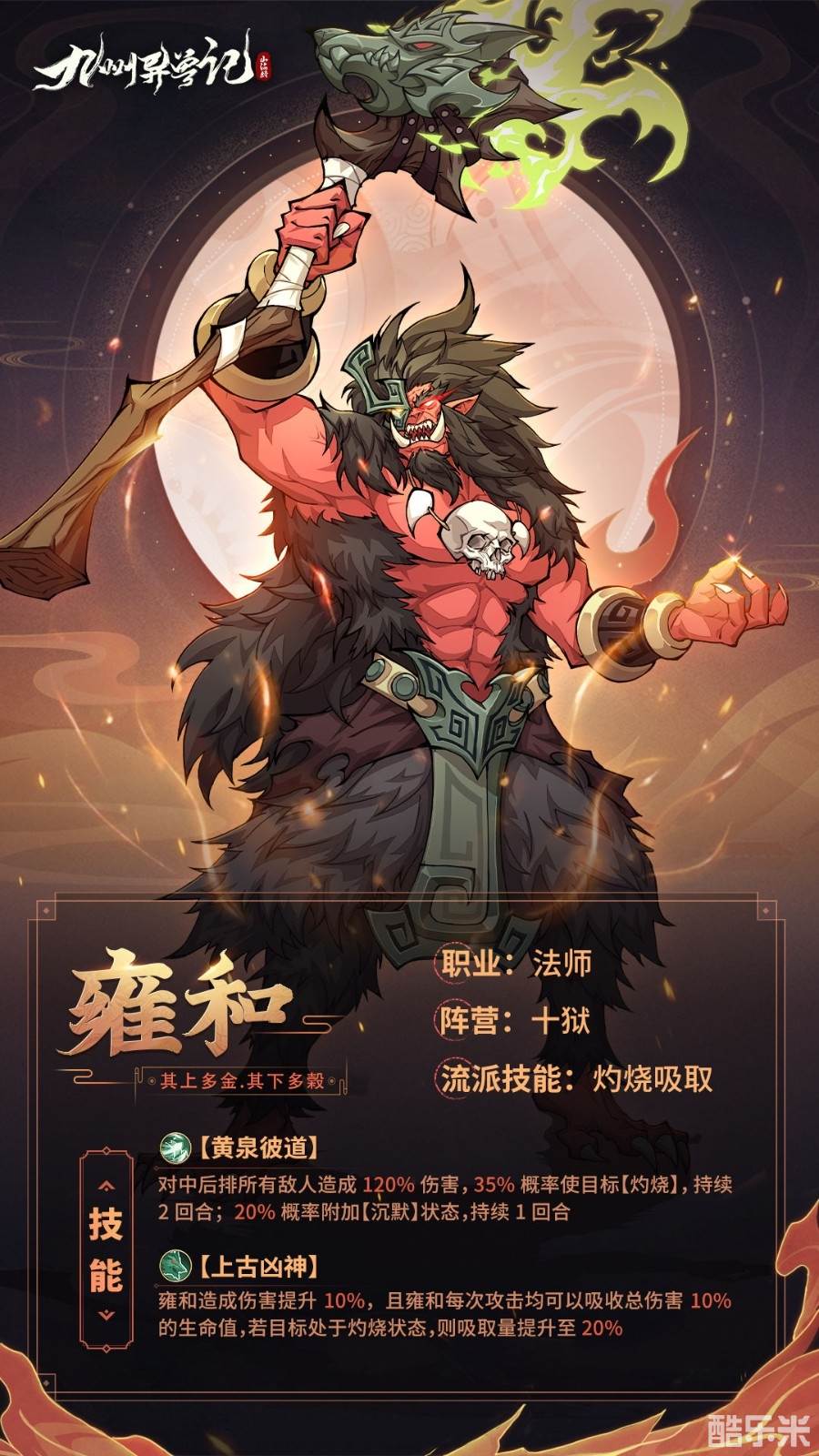 《九州异兽记》是一款可以在山海经世界里捕捉和培养异兽的卡牌策略手游,游戏中雍和怎么样呢?下面是小编给大家带来的《九州异兽记》雍和技能图鉴介绍,感兴趣的小伙伴们一起来看看吧。