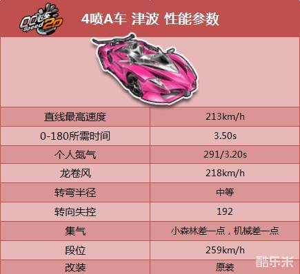 A级赛车津波发行较早。是SSC2012西安站的比赛用车。情侣贵族专属赛车,造型十分漂亮,粉红色的车身更加适合女性玩家驾驶。