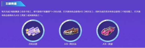 新版本更新后,每天完成一局新赛道【恋恋千阳】,完成任务有机会获得1个千阳宝箱,打开宝箱后有机会获得A车-津波。