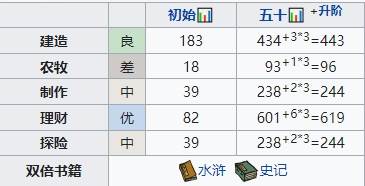 初始属性:建造183,农牧18,制作39,理财82,探险39。