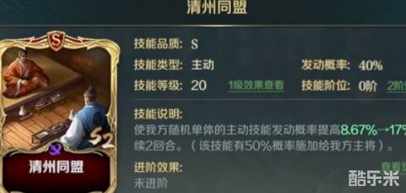【清州同盟】的技能效果是,能够提高我方随机单体的主动技能发动概率,持续两个回合,这个技能有50%的概率会施加给我方主将。