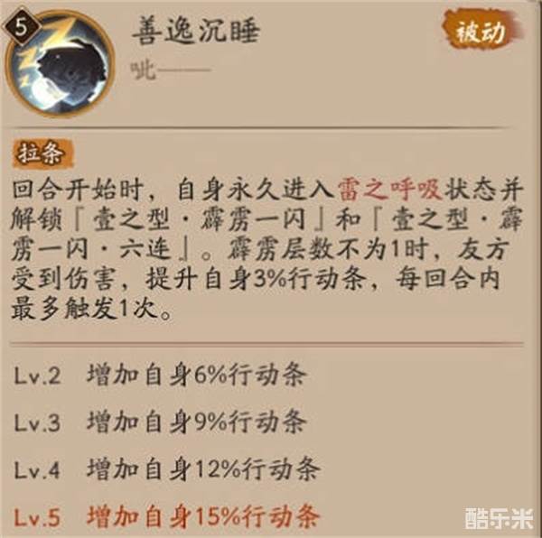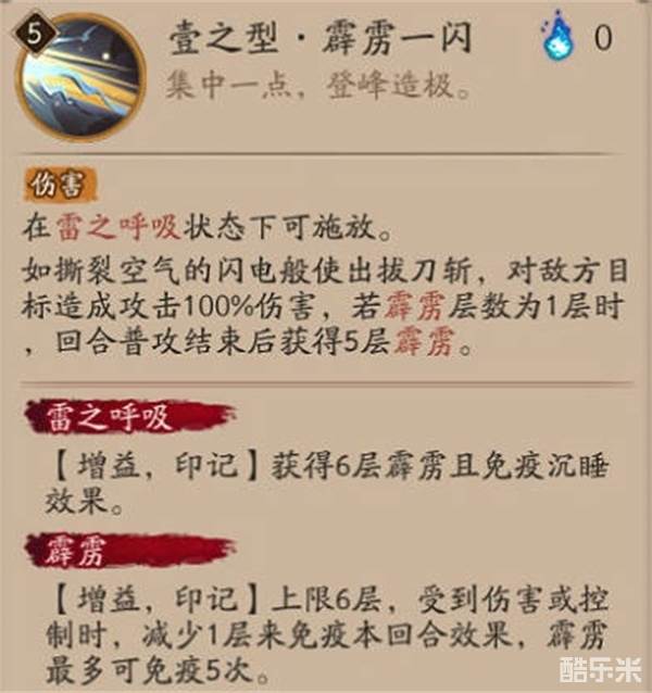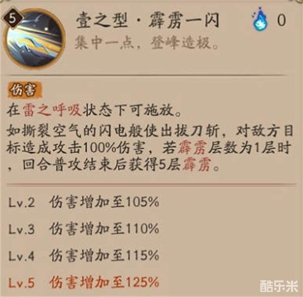 如撕裂空气的闪电般使出拔刀斩,对敌方目标造成攻击100%伤害,若【霹雳】层数为1层时,回合普攻结束后获得5层【霹雳】。