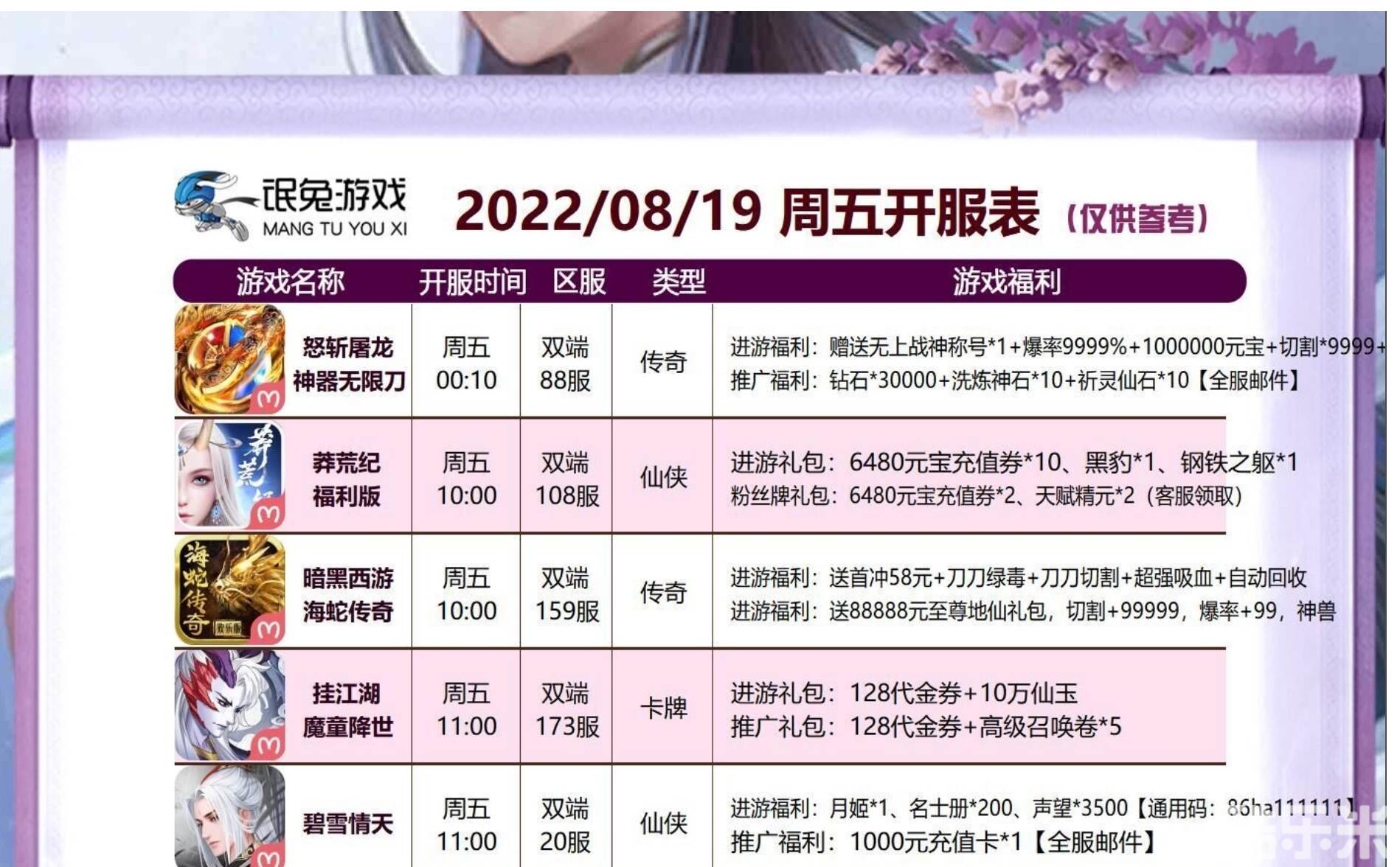 | 莽荒纪-福利版 | 108区( 苹果- 安卓) | 2022-08-19 10:00:00 |