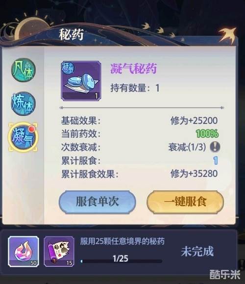 3、秘药:每个境界,都可以服用秘药来提升修为。具体可服用的数量、基础效果、药效比例可以通过修炼界面右上角,点击“秘药”按钮查看和服用。