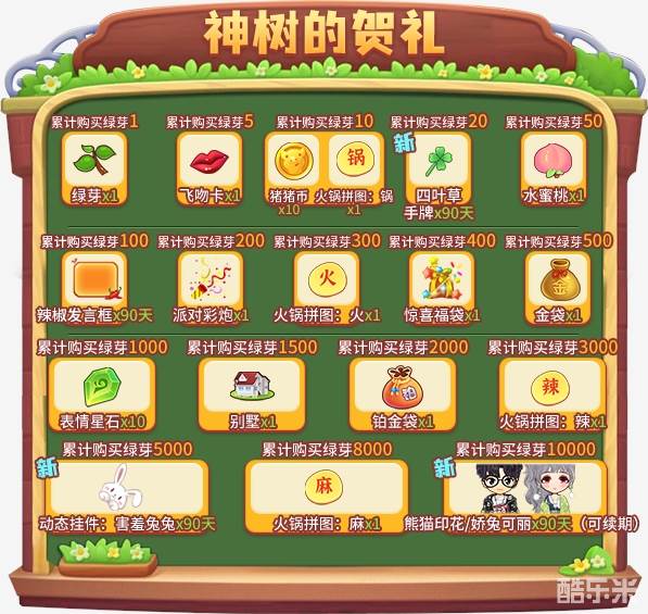 活动期间,根据您在“祈愿神树”购买绿芽的数量,领取神树的贺礼!并且还将对小伙伴们购买绿芽的数量进行排名,在活动结束后,为排行榜上前100名玩家发放奖励!