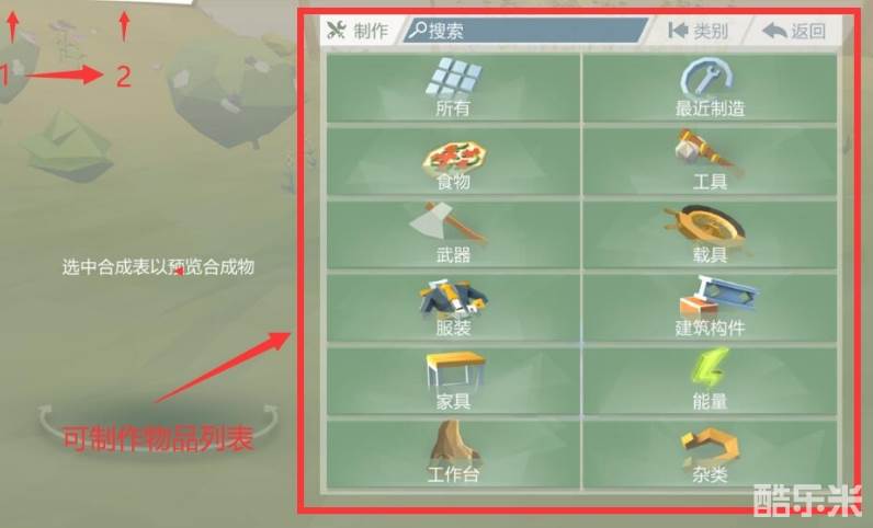 想要制作物品或工具,首先要打开【正在制作】,这里有非常详细的工具、道具分类,根据个人需要点击对应的按钮或图标进入查找(或直接输入词语进行搜索)。