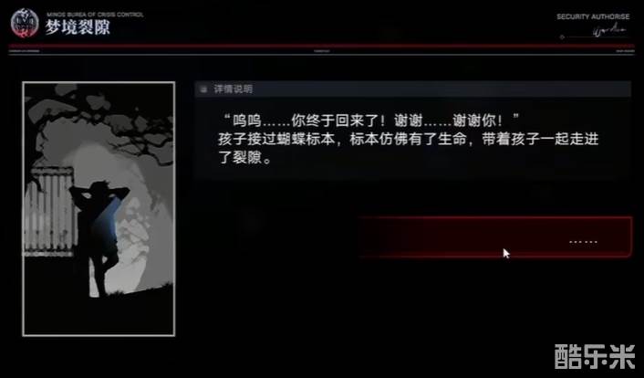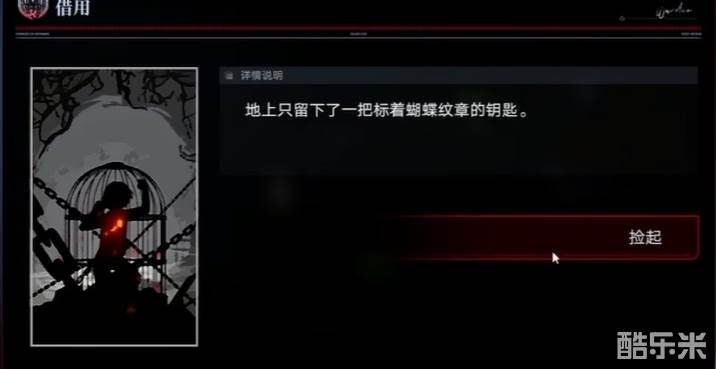从裂隙出来发现右边有红色叹号节点,进去是一个孩子想要我们手里的棘刺,选择给他棘刺,然后孩子嘎了变成蝴蝶,地上留下一个标记着蝴蝶纹章的钥匙,得到蝴蝶钥匙。