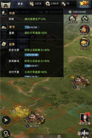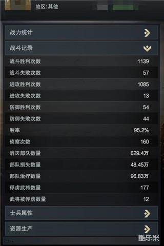 另外,在内城,点击个人头像进入设置页面,在信息详情里面可以参看自身战力统计,查看是那部分的战力比较薄弱,或者查看自己的资源产出加成,士兵属性等等,在个人头像隔壁,有状态的按钮,点击可以参看自身整体加成的情况,如劳役奴隶、季节加成、秘策加成、联盟建筑加成等等。
