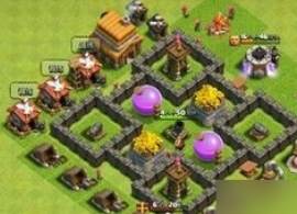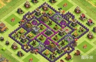最外的箭塔和炮塔没有阻挡,狭小位置放置陷阱,法师塔、迫击炮活力均衡,防空塔三角之势、资源库分离。黑水与部落城堡在中间,防止援兵被偷袭。