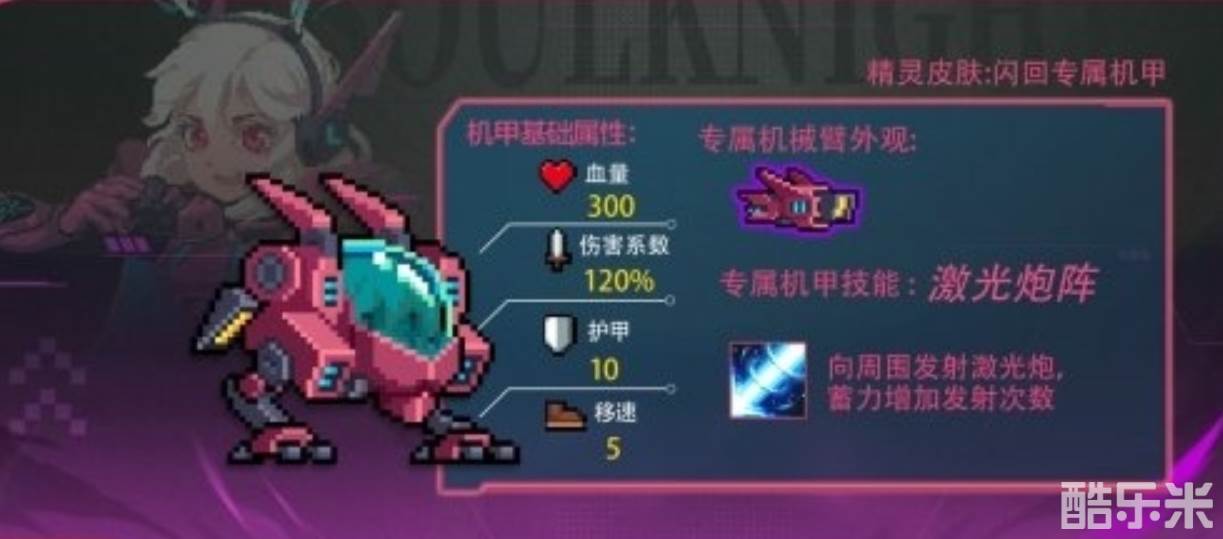 选用该机甲将拥有专属的赛季技能,且初始机械臂的品质为紫色。