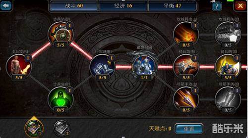 战斗天赋的加点,战斗一栏主要是对各个兵种及对整体伤害的属性加成,在这里面步兵防御和步兵生命是很重要的,步兵承受伤害,几乎对方所有攻击都要由步兵来抗,步兵不光,其他兵是不会死多少的,所以建议大家把所有加步兵生命、防御、伤害的全部加满。没有步兵栏的就加骑兵和弓箭手的防御和攻击,最重要的一点不要所有的都加着走,一般一路往下加就可以了,因为越到后面天赋点需要的越多,所有加着走肯定加不了多少,一般领主到45级以上的玩家建议一路加到生命保护术,因为开着生命保护术打人可以加30%的劫后余生。