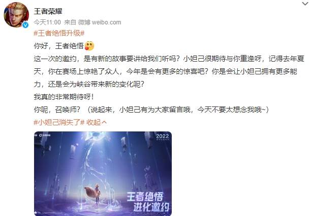 今天进王者发现小妲己不见了,小编以为bug了,还重上了好几遍,还是没有,于是就去网上看看相关内容,看到王者荣耀在11点发了微博,原来小妲己去王者绝悟了!具体悟了什么就要等小妲己回归峡谷才知道了哦!