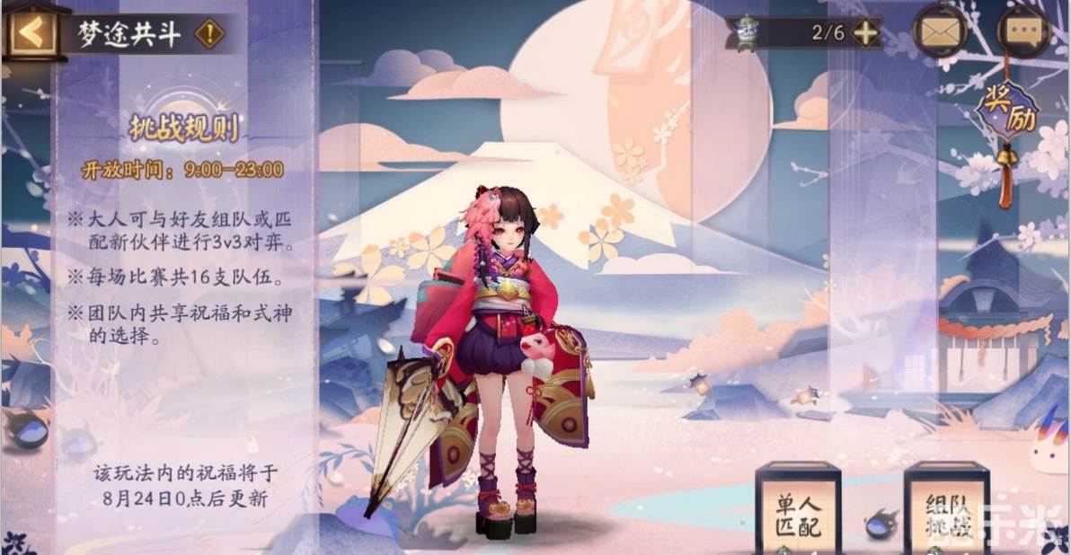 开局可以选择单体匹配or好友一起组队挑战,每场有16个队伍,开局式神+祝福是同样类型供选择,每局对战胜利条件为3局2胜(即3人,有2人胜出即为拿下本局),每胜利一局+5000活动分奖励。