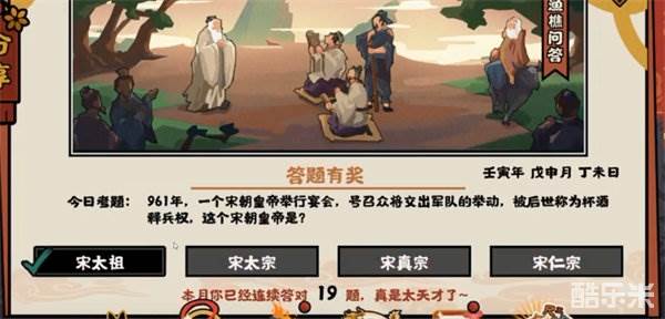1、今日考题:961年,一个宋朝皇帝巨型宴会,好找众将交出军队的举动,被后世称为杯酒释兵权,这个宋朝皇帝是?