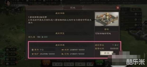 升级箭塔需要消耗策书、木材、铁矿和石料等资源,点击“升级”,开始升级箭塔。