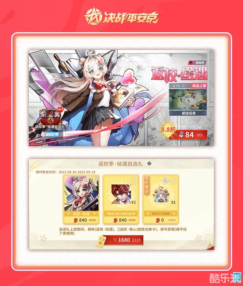 缘结神、鬼童丸全新返校季系列皮肤「返校·绘遇」和「返校·裁心」将分别于8月26日、9月2日维护后上架服装铺,售价均为96皮肤券,首周均享限时8.8折优惠,同时[返校季·绘遇自选礼]全新上架,大人们请勿错过哦~