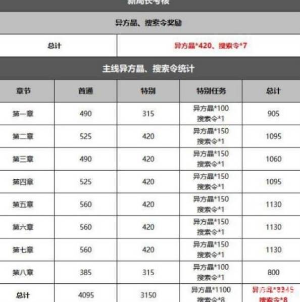 1、开局可以获取的资源有:29540异方晶+66搜索令,每个月还可以固定获得约4000异方晶+9张搜索令。