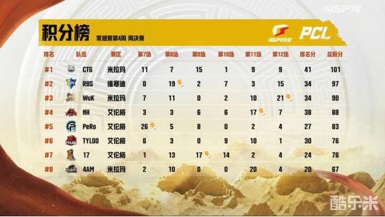 【Krafton Inc.旗下PUBG工作室】冲锋陷阵,虎啸八方!随着夏季赛常规赛第四周比赛结束,常规赛总积分榜尘埃落定。在最后一周的比赛中,各支战队不再有所保留,全力冲刺积分王座:CTG战队队员上下齐心,以高达41分的排名分优势,拿下总积分101分夺得常规赛最后一周周冠军!RBS战队一路坎坷晋级,周决赛上演惊天逆转,以总积分97分力压豪强拿到周亚军;WuK战队周中赛踩线晋级,以不服输的士气,在周决赛中步步为营,最终以两分的微弱优势力压NH战队抢到周季军;下面让我们来回顾下本周的精彩战况: