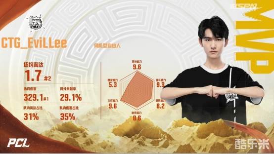 与此同时,本周CTG战队功臣EviLLee选手数据表现十分抢眼:得分能力和生存能力的评分高达9.6分;平均每场伤害值高达329.1,占队内伤害值三成;平均每场的淘汰数为1.7个,实为队内名副其实的大场面先生、CTG战队的得分利器!拿到本周的MVP可谓实至名归!