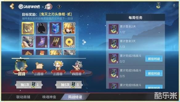 完成同战结谊相关任务即可获得【雷逐之印】,抽取联动专属奖励,包括「鬼灭之刃头像框·贰】、【鬼灭之刃聊天框·贰】、【鬼灭之刃聊天表情集·贰】、【樱子·伊之助】。奖励分阶段进行,需要大人们按照回目逐次抽取奖励,同时仍然可以在已开启的所有奖池中抽取剩余的奖励。