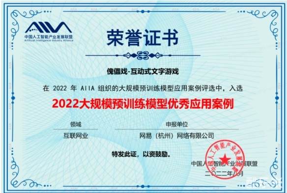 网易旗下手游《遇见逆水寒》的“傀儡戏-互动式文字游戏”玩法更是被评为“2022年大规模预训练模型优秀应用案例”!