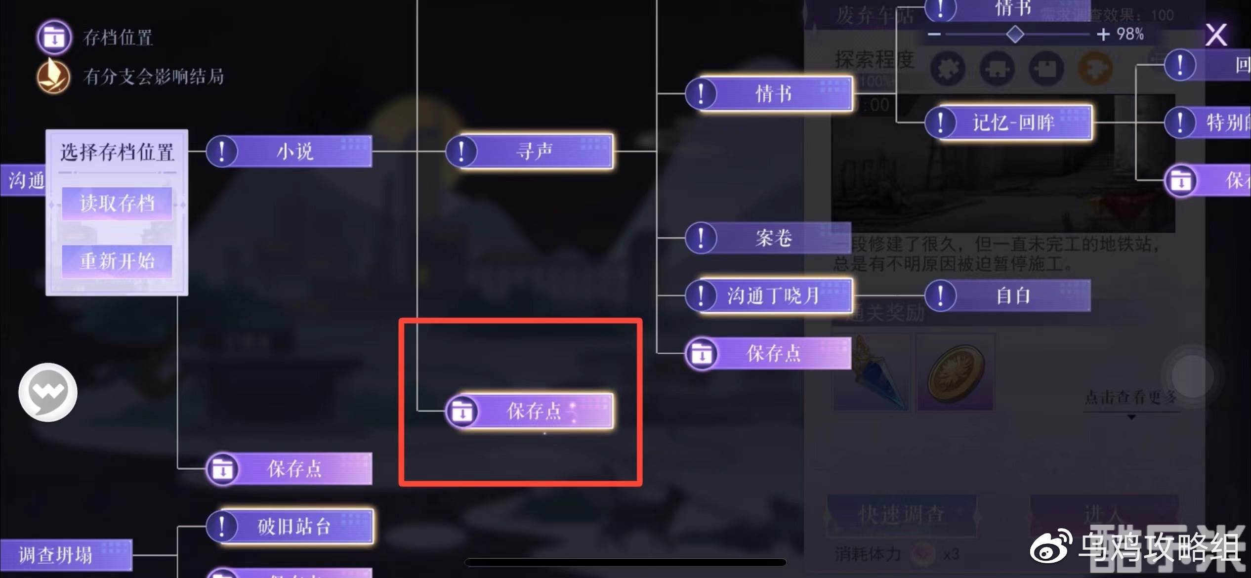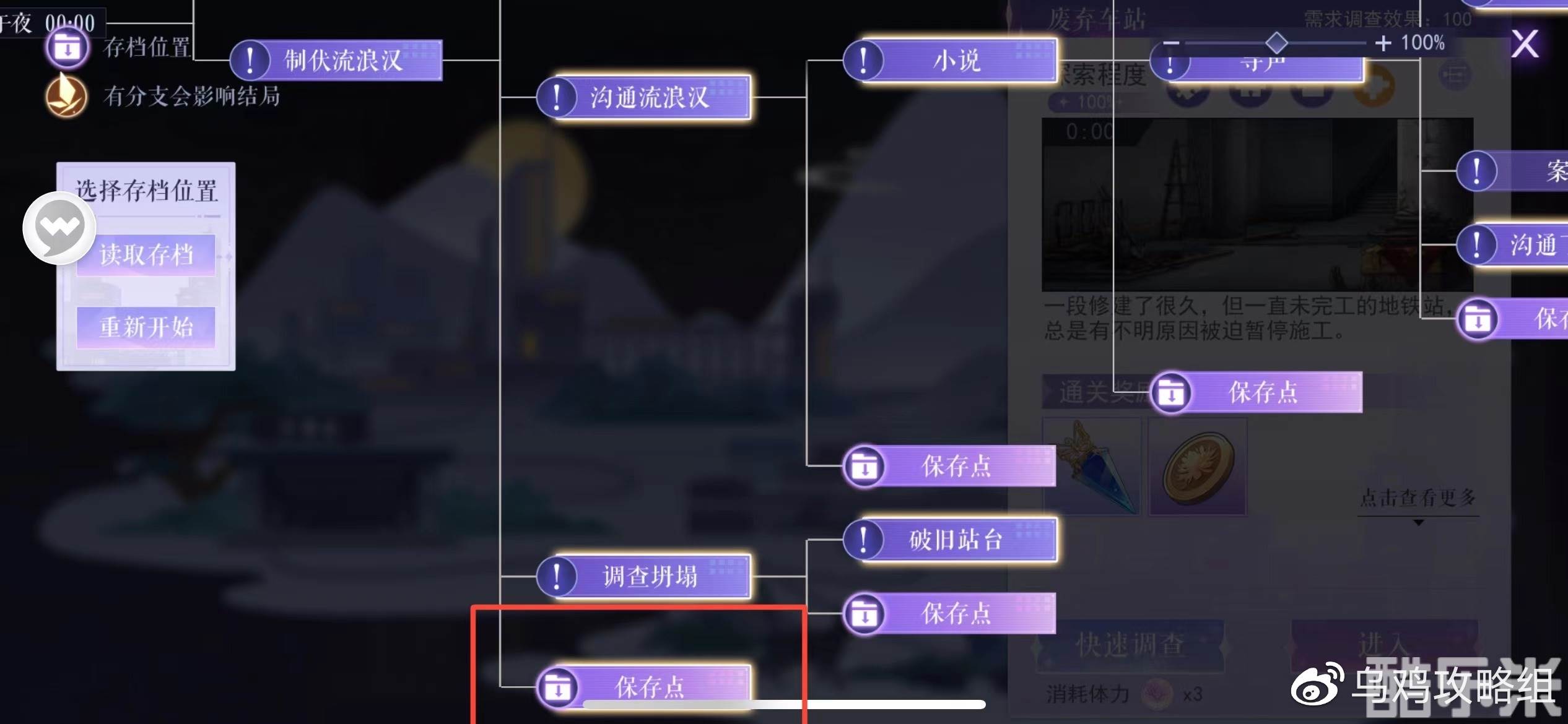 在S结局的基础上回溯到1-3废弃车站的调查,从“调查坍塌”正下方的保存点读取存档