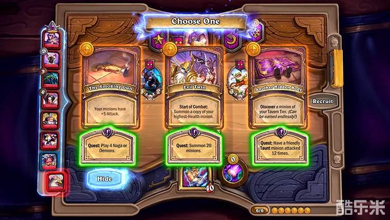 任务的领取时机固定在每局的第4回合,供玩家3选1。PCGamer的预览文章中提到,设计师也试过其他不同时机,但那样太复杂了,6费回合则显得恰到好处,因为那个时候已经“有能力买两个怪了,所以可以开始有针对性地做任务了;也已经买了几个怪了,所以已经有大致方向了。”