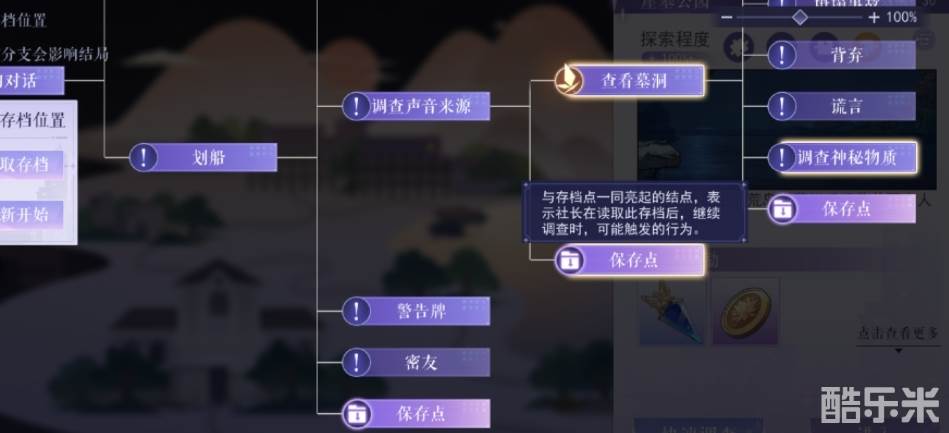从0-3野湖开始设有保存点,回溯后开始调查时可以选择从某个保存点载入,无需从头再来。点击保存点的时候,拓扑图后续发光的位置代表从此保存点进入后可进行的探索行动。