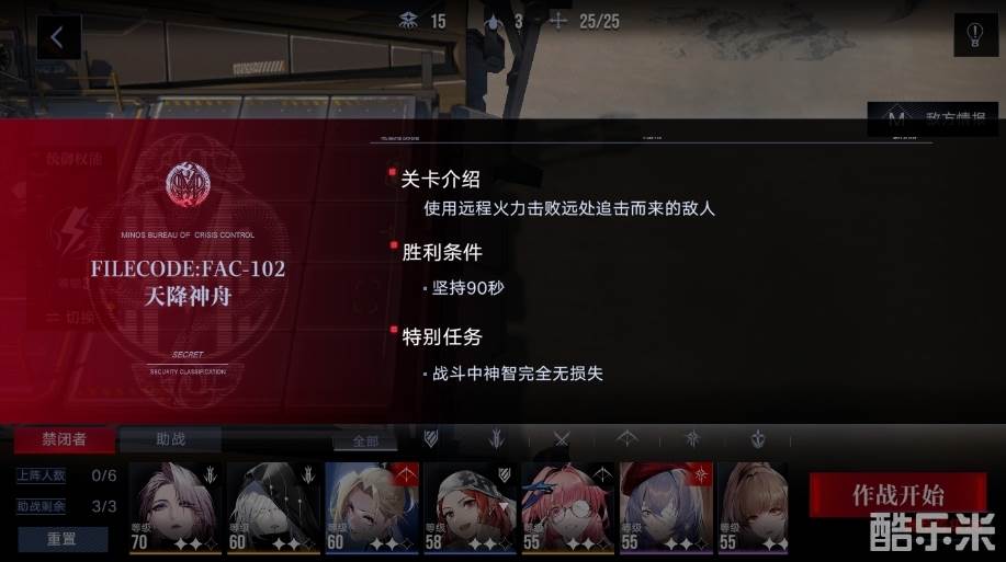 第一关没什么难度,可以上阵6人,需要使用远程角色且坚持90秒,建议大家多带一些精准或者异能角色,手短的近战角色请暂且放弃。另外如果是练度低要凑人的话可以带普攻能攻击的奶妈,毕竟也是手长攻击角色。