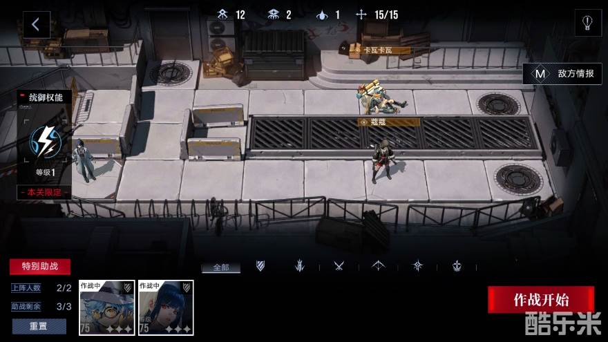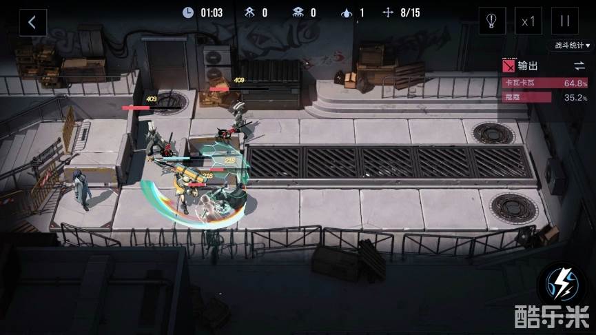 然后蔻蔻挪到前面的初始位置,卡瓦卡瓦解决完手上的敌人也挪去前面打一下敌人,这里后面虽然也会出怪但是出的是远程怪,站在远处不好打。